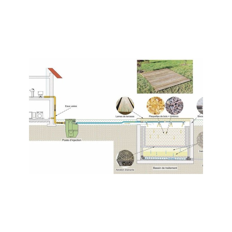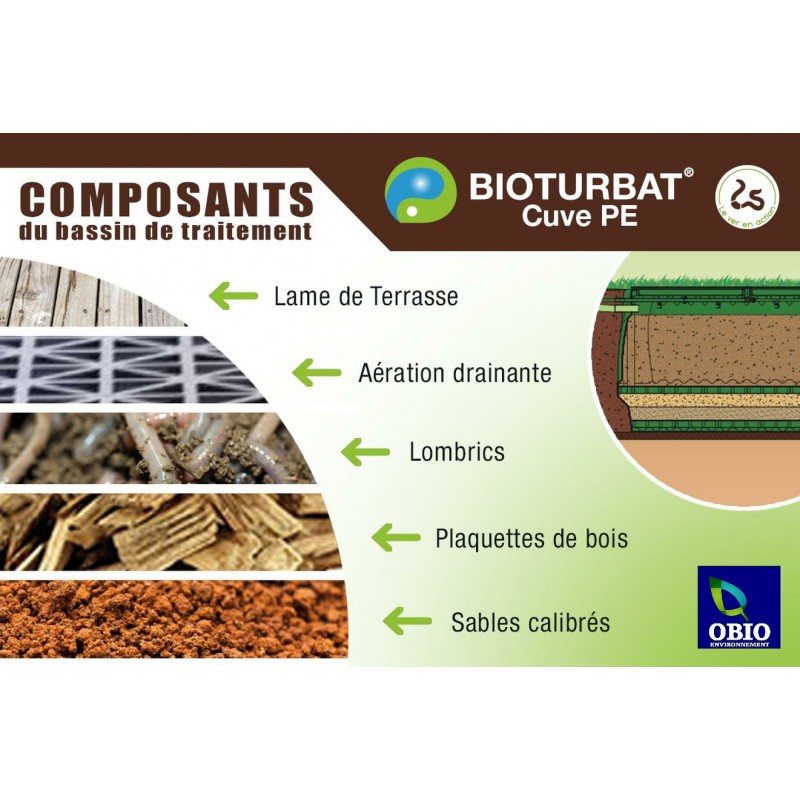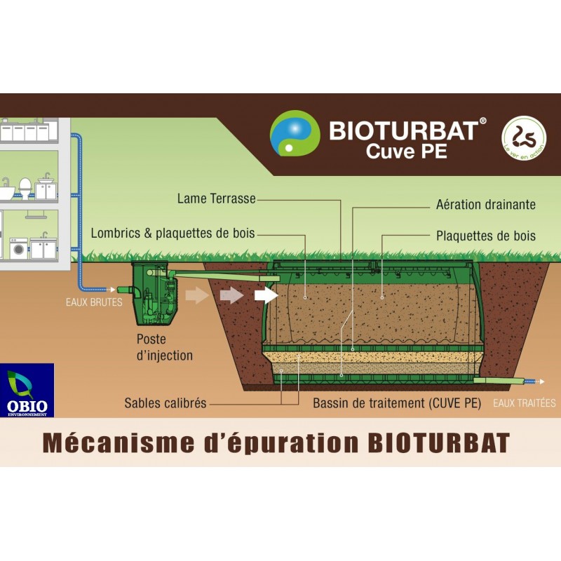 Toutes les eaux usées de la maison (eaux vannes et ménagères) sont collectées dans un poste d’injection, équipé d’une pompe dilacératrice, qui les renvoie ensuite, par bâchées, dans le bassin de traitement. Les effluents sont répartis sur l’ensemble de filtration et percolent à travers une couche de plaquettes de bois où vit une colonie de lombrics « digesteurs » Eisenia andrei et Eisenia fetida. Les lombrics évoluant dans cette partie du dispositif créent de nombreuses galeries et consomment les déchets organiques apportés par les effluents. Les bactéries qui se fixent dans les galeries complètent l’épuration des eaux. Le déplacement continuel des lombrics structure alors le filtre en évitant ainsi tout colmatage. Les lombrics participent donc activement à la dégradation de la matière organique et jouent le rôle de broyeurs, de stimulateurs biologiques ainsi que d’aérateurs du filtre. La lombrification correspond à une combinaison de phénomènes physiques et biologiques qui interagissent ensemble et de façon permanente, essentiellement en condition aérobie (présence d’air). Le dispositif recycle la matière organique à travers les lombrics et les micro-organismes présents dans le filtre, en favorisant sa décomposition et sa stabilisation. Ainsi les 2 processus majeurs (microbiens et lombriciens) agissent simultanément dans le BIOTURBAT CUVE PE.