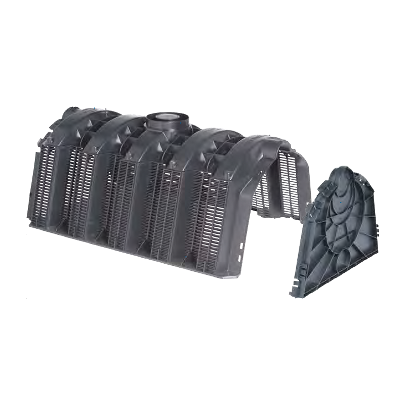 • Le système se compose d’un ou de plusieurs tunnels, de deux parois entrée/sortie, d'un évent et de géotextile. Il peut être dimensionné à volonté.