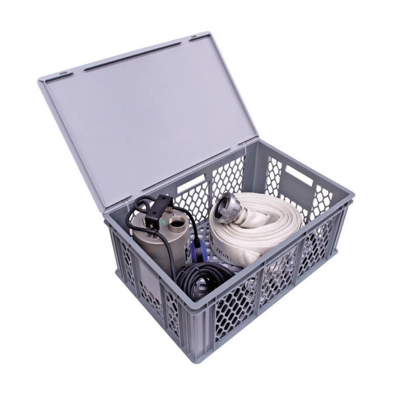 Le kit vide-cave Zenit inclut une pompe DR steel 25 et un tuyau flexible de refoulement dans une pratique boîte. Le raccord rapide permet de fixer facilement le tuyau sur la pompe pour une intervention rapide en cas d'urgence.
