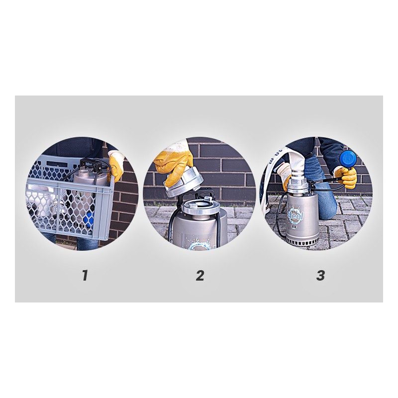 Le kit vide-cave OBIO inclut une pompe DR steel inox Automatique et un tuyau flexible de refoulement dans une pratique boîte. Le raccord rapide permet de fixer facilement le tuyau sur la pompe pour une intervention rapide en cas d'urgence. Le flotteur