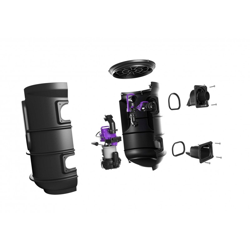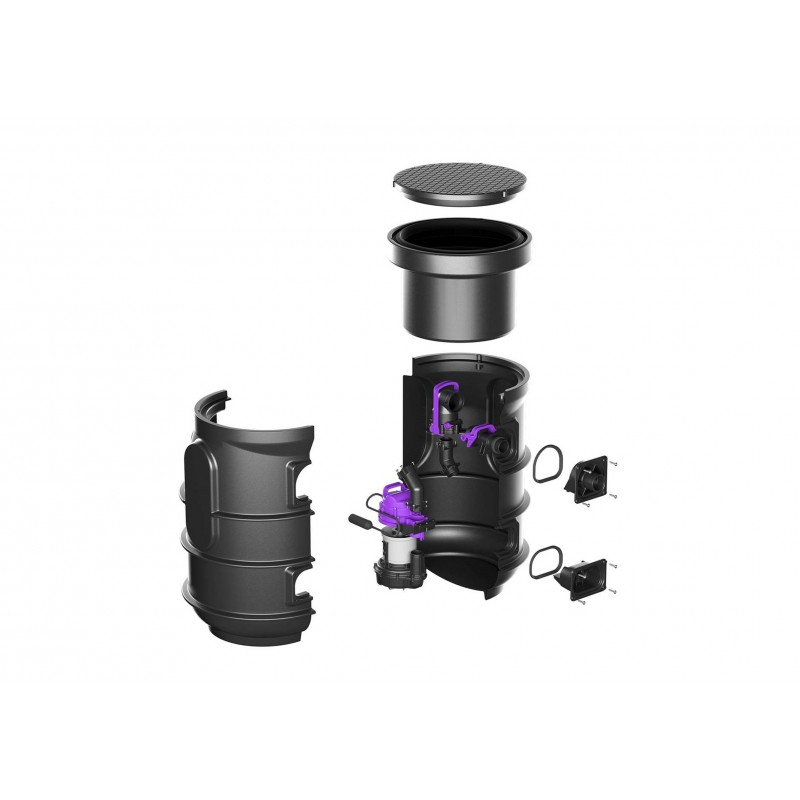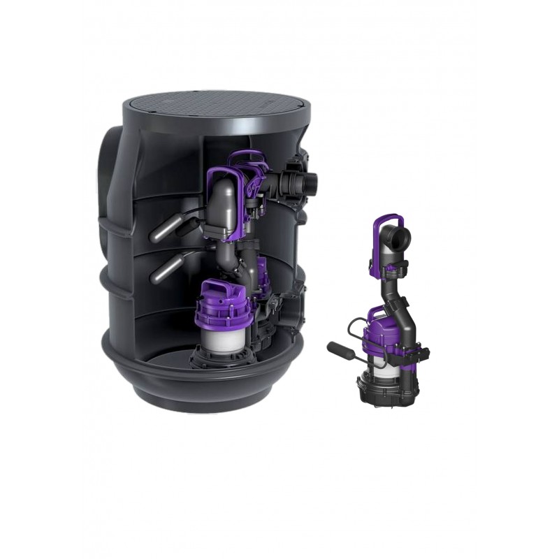 Le volume utile de la cuve est d'environ 25L. Le refoulement est horizontal en diamètre 63 (DN50). L’ensemble fourni se compose de la cuve, de la pompe STF1300 équipée d'une roue vortex pilotée par flotteur et d’un clapet anti-retour.