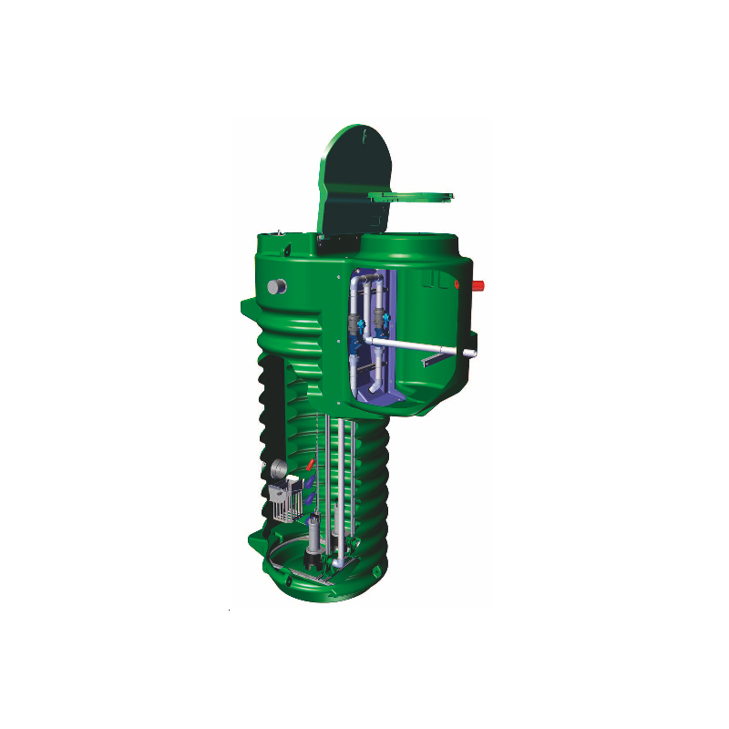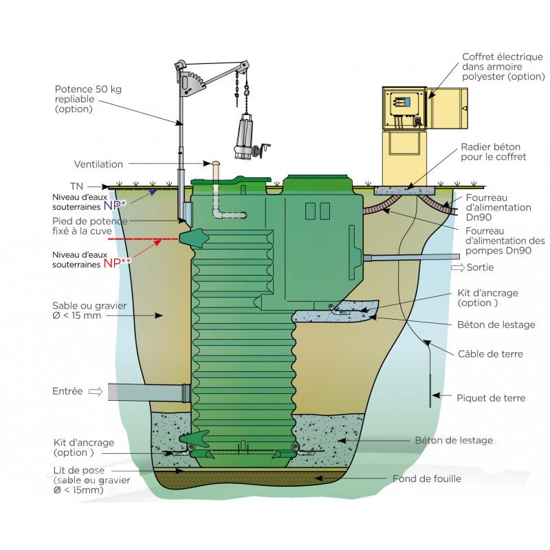 Cuve en polyéthylène à haute résistance mécanique et insensible aux effets de la corrosion - Regard de vannage intégré en polyéthylène - Volume utile sous fil d’eau : 875 L - 1 couvercle polyester cadenassable et articulé avec compas pour maintien en position ouverte - 1 couvercle diamètre de passage 680mm, fermeture 1/4 de tour et vis de sécurité - Manchon d’entrée PVC femelle à joint pour tube PVC Ø200 ext - Tube de sortie PVC pression à coller Ø75 ext -Manchon de ventilation PVC femelle à joint Ø100 avec bouchon - 2 fourreaux passe-câbles TPC Ø 76/90 - • Sangles de manutention pour une ins Equipement intérieur : 2 pompes immergées - Système de pieds d’assise fonte et barres de guidage acier inoxydable - facilite la mise en place des pompes - 2 chaînes de pompes certifiées levage - 2 canalisations de refoulement PVC pression ø63 int- 1 support en inox (pour le panier dégrilleur hauteurs 2m50 à 3m50) - 1 sonde piézométrique (10 m de câble) et 1 flotteur alarme (10 m de câble) montés sur chaîne avec contrepoids, > Equipement propre au regard - 2 vannes PVC à sphère et 2 clapets fonte à boule anti-retour Dn65 int - l'ensemble montés sur raccords union 3 pièces - 1 lyre de raccordement PVC.
